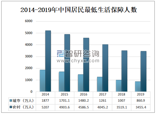 随着国家经济实力的不断增强,以及国家扶贫政策的精准实施,我国居民最低生活保障人数逐年减少,2019年中国城市居民最低生活保障人数为860.9万人,较上年减少146.1万人;农村居民最低生活保障人数为3455.4万人,较上年减少63.7万人。