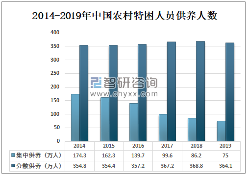 在供养方面,我国对农村供养服务机构投入很多,比如民政部利用福彩公益金实施的“霞光计划”就是针对农村特困人员供养服务机构的建设改造开展的。我国对特困人员的供养方式即一种是集中供养、一种是分散供养。2019年中国农村特困人员集中供养人数为75万人,分散供养人数为364.1万人。