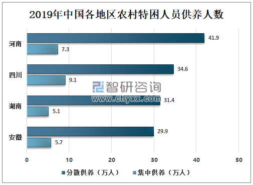 2019年全国农村特困人员集中供养人数为75万人,其中河南、四川、湖南、安徽农村特困人员集中供养人数分别为7.3、9.1、5.1、5.7万人;2019年全国农村特困人员分散供养人数为364.1万人;其中河南、四川、湖南、安徽农村特困人员分散供养人数分别为41.9、34.6、31.4、29.9万人。