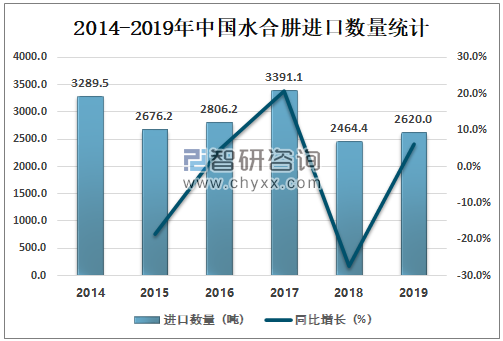 智研咨询发布的《2021-2027年中国水合肼行业发展现状调查及投资前景趋势报告》显示: 2015-2017年中国水合肼进口数量逐年增加,2018年有所回落,2018年中国水合肼进口数量为2464.4吨,较2017年减少了927吨,2019年较2018年有所增长,2019年中国水合肼进口数量为2620.0吨,较2018年增加了156吨。