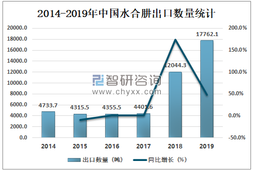 2017-2019年中国水合肼出口数量逐年增加,2018年中国水合肼出口数量为12044.3吨,较2017年增长了7643吨;2019年中国水合肼出口数量为17762.1吨,较2018年增长了5718吨。