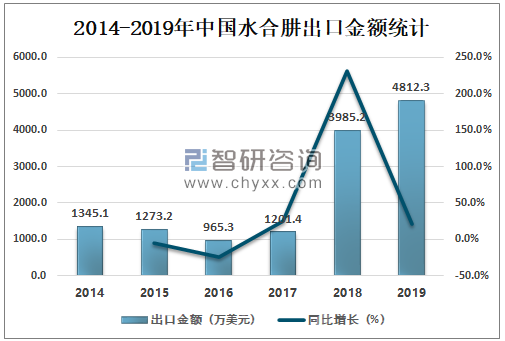 2017-2019年中国水合肼出口金额逐年增加,2018年中国水合肼出口金额为3985.2万美元,同比增长231.7%;2019年中国水合肼出口金额为4812.3万美元,同比增长20.8%。