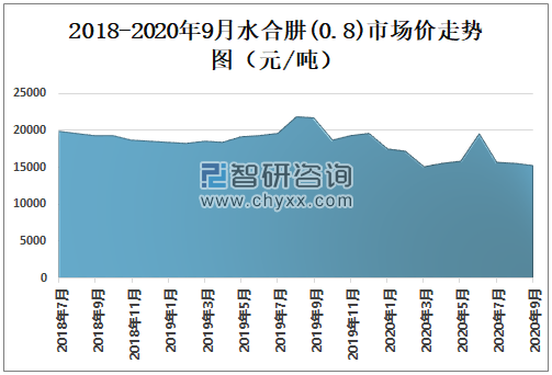 2020年1月水合肼(0.8)市场价开始下滑,4月短暂回升后,6月又开始下滑。2020年9月水合肼(0.8)市场价为15200元/吨,较2020年1月减少了2300元/吨。