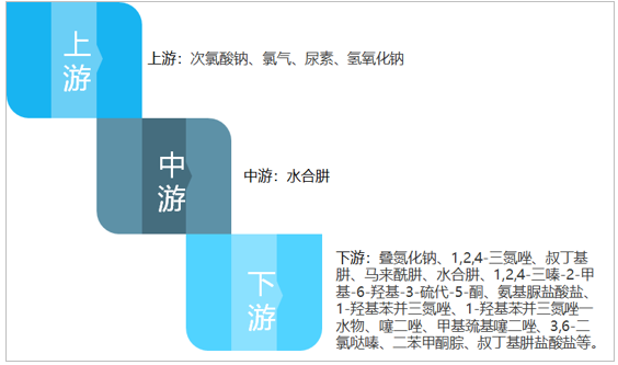 水合肼的原料主要有次氯酸钠、氯气、尿素、氢氧化钠等,下游产品非常丰富,主要有叠氮化钠、1,2,4-三氮唑、叔丁基肼、马来酰肼、水合肼、1,2,4-三嗪-2-甲基-6-羟基-3-硫代-5-酮、氨基脲盐酸盐、1-羟基苯并三氮唑、1-羟基苯并三氮唑一水物、噻二唑、甲基巯基噻二唑、3,6-二氯哒嗪、3,3'-二氯-4,4'-联苯二胺,盐酸盐、二苯甲酮腙、叔丁基肼盐酸盐。