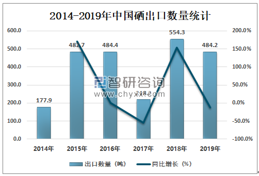 2018年中国硒出口数量为554.3吨,同比增长154.0%;2019年中国硒出口数量为484.2吨,同比减少12.7%。