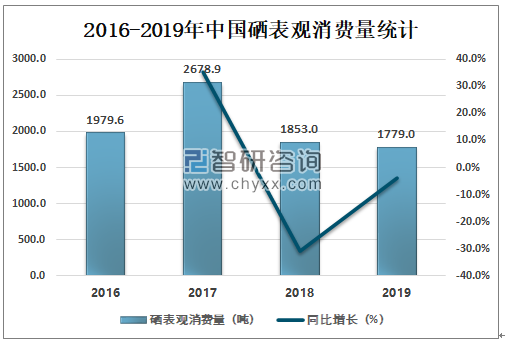 2016-2019年中国硒表观消费量统计