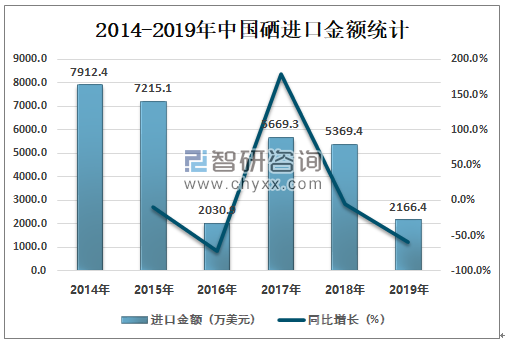 2017-2019年中国硒进口金额逐年减少,2018年中国硒进口金额为5369.4万美元,同比减少5.3%;2019年中国硒进口金额为2166.4万美元,同比减少59.7%。
