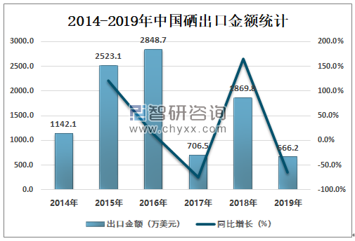 2018年中国硒出口金额为1869.8万美元,同比增长164.7%;2019年中国硒出口金额为666.2万美元,同比减少64.4%。