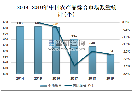 2015-2019年中国农产品综合市场数量逐年减少,2018年中国共有农产品综合市场648个,较2017年减少了13个;2019年中国共有农产品综合市场634个,较2018年减少了14个。
