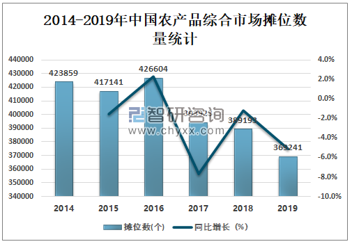 智研咨询发布的《2020-2026年中国农产品行业市场供需规模及市场供需预测报告》数据显示:随着中国农产品综合市场数量的减少,摊位数量也在减少,2019年中国农产品综合市场共有摊位369241个,较2018年减少了19952个。