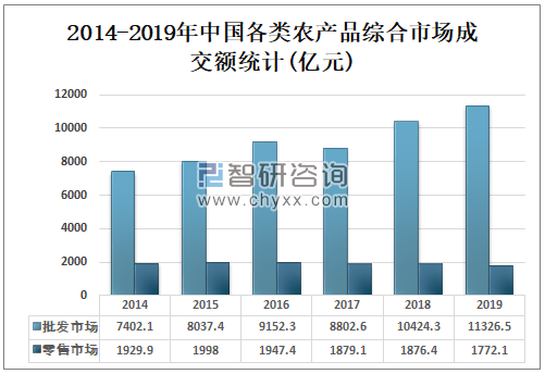 2019年中国农产品综合批发市场成交额为11326.5亿元,较2018年增长了902.18亿元;2019年中国农产品综合零售市场成交额为1772.1亿元,较2018年减少了104.30亿元。