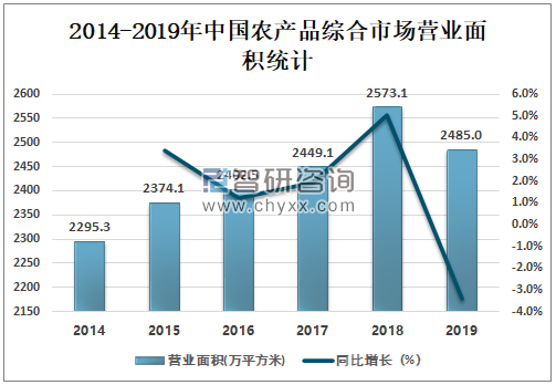 2014-2018年中国农产品综合市场营业面积逐年增加,2019年开始减少,2019年中国农产品综合市场营业面积为2485.0万平方米,较2018年减少了88万平方米。