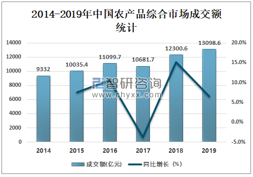 虽然2019年中国农产品综合市场数量和摊位数量都在减少,但成交额却在增加,2019年中国农产品综合市场成交额达13098.6亿元,同比增长6.5%。