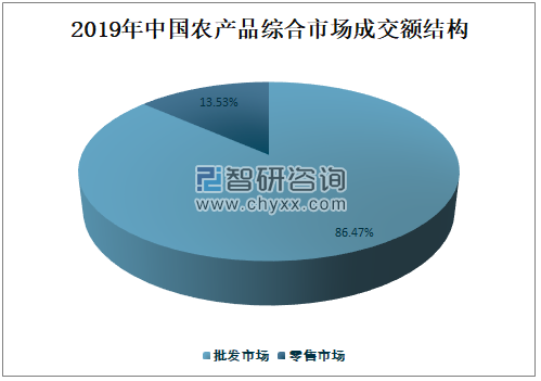 2019年中国农产品综合批发市场成交额占总成交额的86.47%,占比较大;2019年中国农产品零售市场成交额占总成交额的13.53%,占比较小。