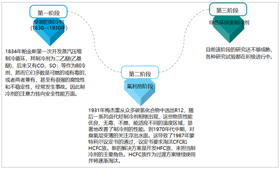 制冷剂的发展历史大致可分为三个阶段。第一阶段:早期的制冷剂(1830—1930年),1834年帕金斯第一次开发蒸汽压缩制冷循环,其制冷剂为二乙醚(乙基醚),后来又有CO、SO:等作为制冷剂,然而它们多数是可燃的或有毒的,或者两者兼有,甚至有很强的腐蚀性和不稳定性,经常发生事故。因此制冷剂的注意力转向安全性能方面。第二阶段:氟利昂阶段。1931年梅杰雷从众多碳氢化合物中选出R12,随后一系列卤代烃制冷剂相继出现,这些物质性能优良、无毒、不燃,能适应不同的温度区域,显著地改善了制冷剂的性能。几种制冷剂在空调中变得很普遍,包括CFC11、CFC12、CFC113、CFC114和HCFC22。到1970年代中期,对臭氧层变薄的关注浮出水面。这导致了1987年蒙特利尔议定书的通过,议定书要求淘汰CFC和HCFC族。新的解决方案是开发HFC族,来担当制冷剂的主要角色。HCFC族作为过渡方案继续使用并将逐渐淘汰。第三阶段:绿色环保类制冷剂。目前该阶段的研究还不够成熟,各种研究试验都在积极进行中。