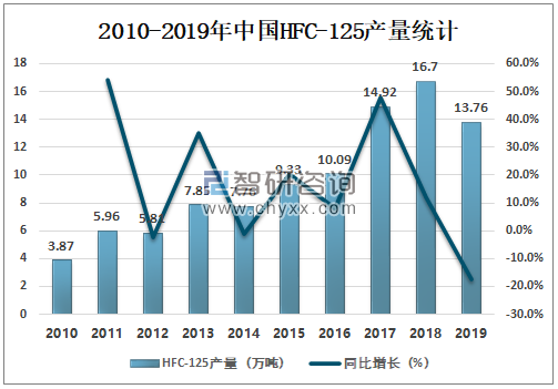 制冷技术在当今社会飞速发展,其应用日益广泛,无论是家用电冰箱、空调器,还是商用冷冻、冷藏及医疗、科研等领域无所不及。而制冷剂作为制冷设备的‘血液”,各类产品产量增长迅速。2019年中国HFC-125产量为13.76万吨,较2010年的3.87万吨增长了9.89万吨。