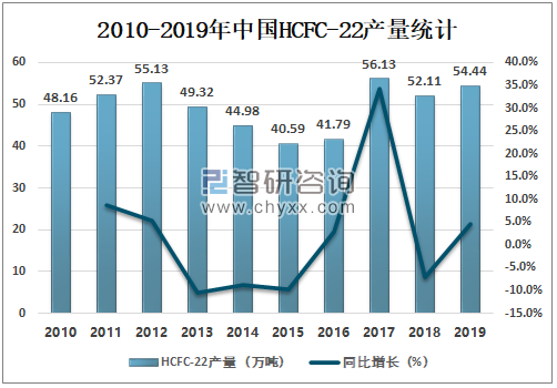 2012-2015年中国HCFC-22产量逐年下滑,2016年开始恢复增长,经历2017年的飞速增长后2018年中国HCFC-22产量小幅下滑,2019年开始继续增长,2019年中国HCFC-22产量为54.44万吨,较2018年增加了2.33万吨,同比增速为4.5%。