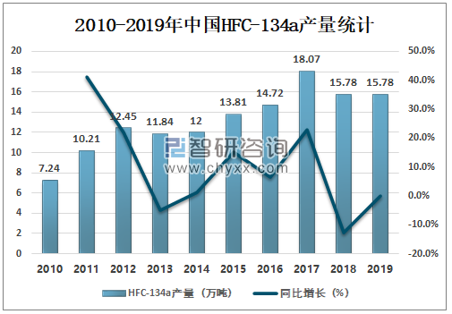 2013-2017年中国HFC-134a产量逐年增加,2018年较2017年有所下滑,2018年中国HFC-134a产量为15.78万吨,较2017年减少了2.29万吨,2019年中国HFC-134a产量与2018年持平。