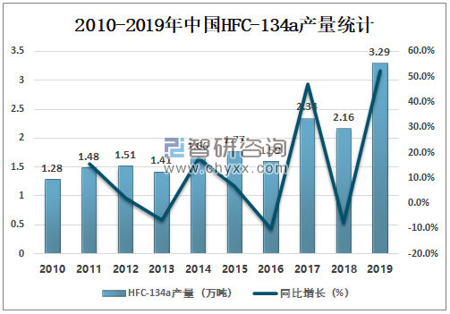 总体来看中国HFC-134a产量呈增长趋势,2019年中国HFC-134a产量为3.29万吨,较2018年增加了1.13万吨,同比增速为52.3%。