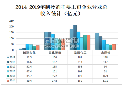 2014-2019年制冷剂主要上市企业营业总收入统计(亿元)