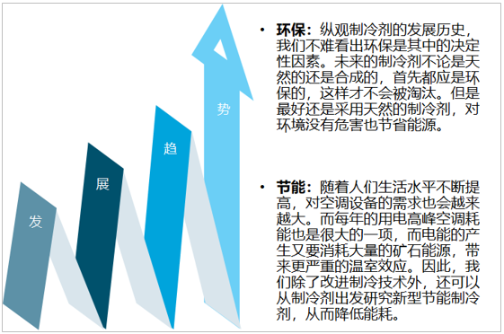 为了保护环境,减小温室效应,那么制冷剂的发展趋势应符合两方面的要求:一是环保。纵观制冷剂的发展历史,我们不难看出环保是其中的决定性因素。未来的制冷剂不论是天然的还是合成的,首先都应是环保的,这样才不会被淘汰。但是最好还是采用天然的制冷剂,对环境没有危害也节省能源。二是节能。随着人们生活水平不断提高,对空调设备的需求也会越来越大。而每年的用电高峰空调耗能也是很大的一项,而电能的产生又要消耗大量的矿石能源,带来更严重的温室效应。因此,我们除了改进制冷技术外,还可以从制冷剂出发研究新型节能制冷剂,从而降低能耗。