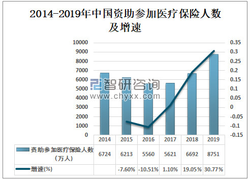 随着经济社会的发展和居民收入的增加,逐步完善医疗救助制度。2016年以来我国资助参加医疗保险人数逐年增多,2019年中国资助参加医疗保险人数为8751万人,较上年增加2059万人,同比增长30.77%。