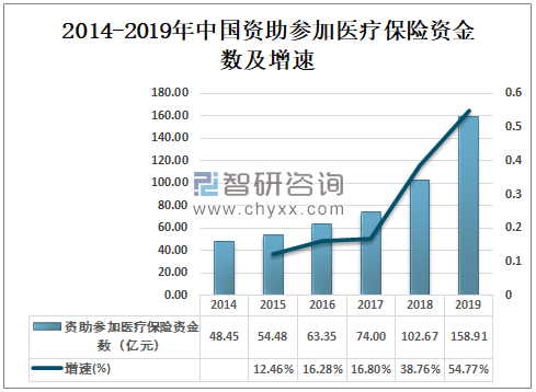 随着经济水平的发展,一方面,居民的经济收入在发生变化,另一方面,国家财政和各种途径对医疗救助的投入逐步增长。近年来我国资助参加医疗保险资金数逐年增加,2019年中国资助参加医疗保险资金数为158.91亿元,较上年增加56.24亿元,同比增长54.77%。