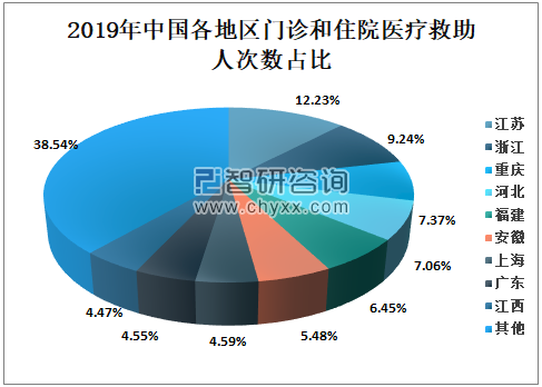 2019年江苏省门诊和住院医疗救助人次数最多,次数达到862.4万人次,占全国门诊和住院医疗救助人次数的12.23%;其次是浙江、重庆门诊和住院医疗救助人次数分别是651.5、519.9万人次,占全国门诊和住院医疗救助人次数的9.24%、7.37%。