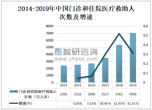 智研咨询发布的《2021-2027年中国医疗服务行业市场运行状况及发展前景预测报告》数据显示:近年来我国门诊和住院医疗救助人次数逐年增加,2019年中国门诊和住院医疗救助人次数是7050万人次,较上年增加1689万人次,同比增长31.51%。