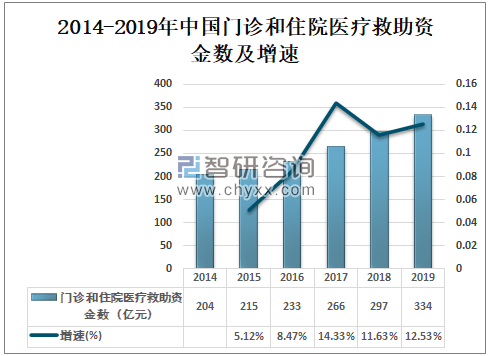 2014-2019年中国门诊和住院医疗救助资金数逐年增多,2019年中国门诊和住院医疗救助资金数为334亿元,较上年增加37亿元,同比增长12.53%。