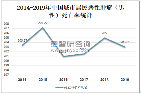 2016-2018年中国城市居民恶性肿瘤(男性)死亡率逐年上升,2018年中国城市居民恶性肿瘤(男性)死亡率为205/10万,较2017年增加了3.5/10万,2019年较2018年有所下降,2019年中国城市居民恶性肿瘤(男性)死亡率为203.01/10万,较2018年减少了2/10万。