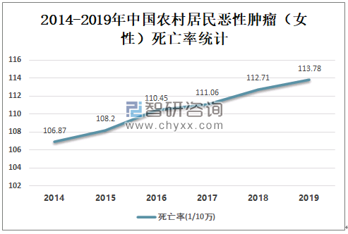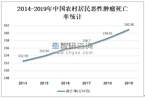 中国农村居民恶性肿瘤死亡率持续增长,2018年中国农村居民恶性肿瘤死亡率为158.61/10万,较2017年增加了1.9/10万;2019年中国农村居民恶性肿瘤死亡率为160.96/10万,较2018年增加了2.4/10万。