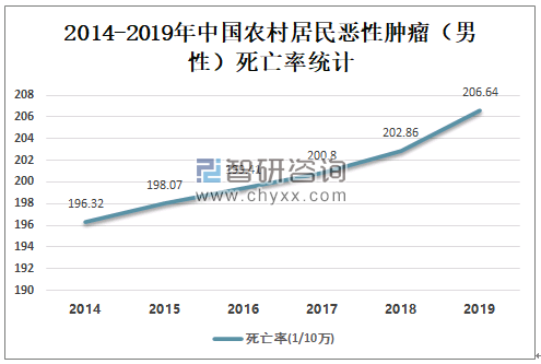 中国农村居民恶性肿瘤(男性)死亡率持续增长,2018年中国农村居民恶性肿瘤(男性)死亡率为202.86/10万,较2017年增加了2.1/10万;2019年中国农村居民恶性肿瘤(男性)死亡率为206.64/10万,较2018年增加了3.8/10万。