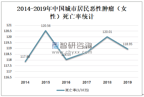 2016-2018年中国城市居民恶性肿瘤(女性)死亡率逐年上升,2018年中国城市居民恶性肿瘤(女性)死亡率为120.01/10万,较2017年增加了1.3/10万,2019年较2018年有所下降,2019年中国城市居民恶性肿瘤(女性)死亡率为118.95/10万,较2018年减少了1.1/10万。