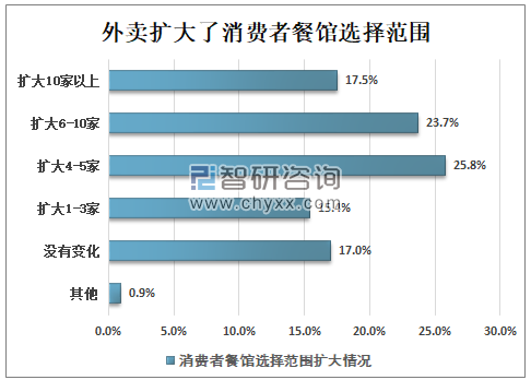 通常情况下,人们往往会选择在周围1公里范围内就近用餐。外卖配送大大提升了消费者就餐的便利性和丰富性,将人们的餐馆选择范围扩大至周围3公里甚至5公里。82. 1%的消费者表示外卖扩大了自己的餐馆选择范围,其中,17.5%的消费者表示外卖将餐馆选择扩大了10家以上,23. 4%的消费者表示外卖将餐馆选择扩大了6-10家。
