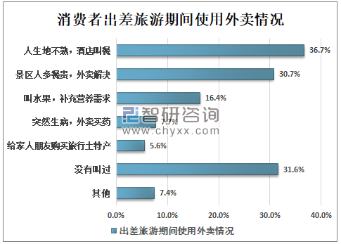 在回答“是否在出差或旅行期间叫过外卖(可多选)”时,36.7%的消费者选择“人生地不熟,酒店叫餐”;30. 7%的消费者选择“景区人多餐贵,外卖解决”;16. 4%的消费者曾经在出差旅行期间通过外卖下单“叫水果,补充营养需求”;7. 7%的消费者表示出差旅行期间“突然生病,通过外卖买药”。