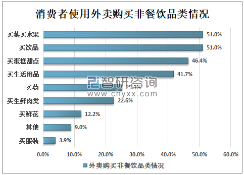 51.0%的消费者表示曾使用外卖买菜买水果、买饮品,46. 4%的消费者曾使用外卖买蛋糕甜点,41.7%的消费者曾使用外卖买生活用品,25.3%的消费者曾使用外卖买药,22. 6%的消费者曾使用外卖买生鲜肉类,还有消费者表示曾使用外卖买鲜花、服装等商品。外卖的配送速度快、时效性强,30分钟至1个小时就可配送到家,极大地方便了人们的日常生活。