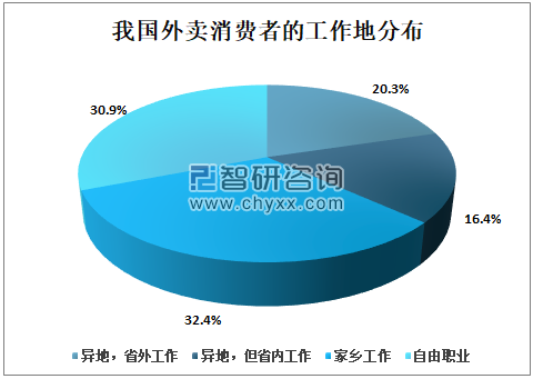 2019年我国城镇常住人口占总人口的比重已经达到60. 6%,城镇化的发展推动了地区间的人口流动,很多劳动者选择独自在异地工作,这也促进了外卖产业的发展。有工作的外卖消费者中,20. 3%属于在异地、省外工作,16. 4%属于在异地但是省内工作,32. 4%属于在家乡工作,30. 9%属于自由职业。