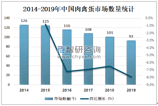 近年来中国肉禽蛋市场数量逐年减少,2018年中国共有肉禽蛋市场101个,较2017年减少了7个;2019年中国共有肉禽蛋市场93个,较2018年减少了8个。