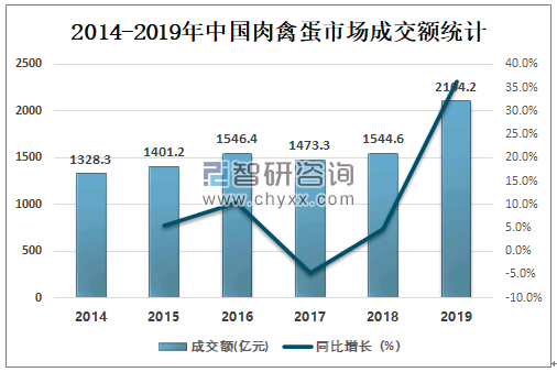 总体来看中国肉禽蛋市场成交额持续增长,2018年中国肉禽蛋市场成交额为1544.6亿元,同比增长4.8%;2019年中国肉禽蛋市场成交额为2104.2亿元,同比增长36.2%。