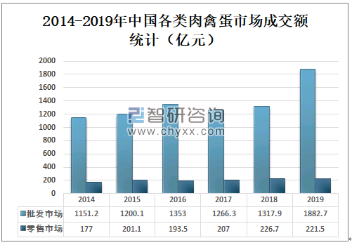 2019年中国肉禽蛋批发市场成交额为1882.7亿元,较2018年增加了564.8亿元;2019年中国肉禽蛋零售市场成交额为221.5亿元,较2018年减少了5.2亿元。