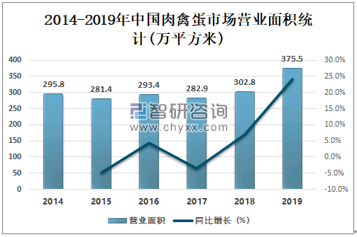 虽然2019年中国肉禽蛋市场数量和摊位数量都在减少,但营业面积却在增加,2019年中国肉禽蛋市场营业面积为375.5万平方米,较2018年增加了72.7万平方米,这说明中国肉禽蛋市场正在向集中化、规模化方向发展。