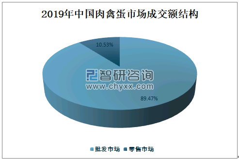 2019年中国肉禽蛋批发市场成交额占总成交额的89.47%,占比非常大;2019年中国肉禽蛋零售市场成交额占总成交额的10.53%,占比较小。