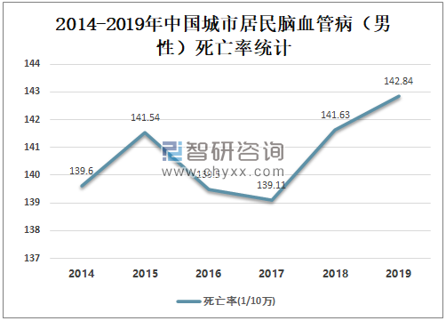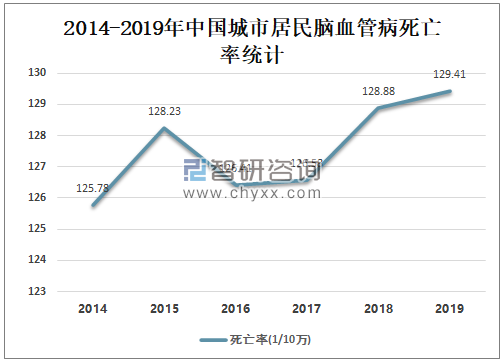 脑血管疾病作为中老年人群常见危重慢性病,致残率、致死率均较高,多数患者会留下肢体活动障碍、口眼歪斜等后遗症,且在康复期出现并发症几率高,对患者晚年生活质量和生命安全造成重要影响。2017-2019年中国城市居民心脏病死亡率持续攀升,2018年中国城市居民脑血管病死亡率为128.88/10万,较2017年增加了2.3/10万;2019年中国城市居民脑血管病死亡率为129.41/10万,较2018增加了0.53/10万。