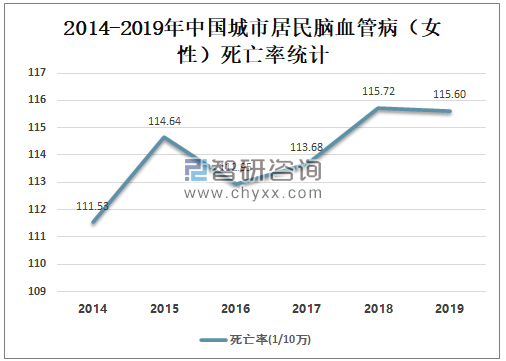 2016-2018年中国城市居民心脏病(女性)死亡率持续攀升,2018年中国城市居民脑血管病(女性)死亡率为115.72/10万,较2017年增加了2.04/10万,2019年中国城市居民心脏病(女性)死亡率开始下降,2019年中国城市居民脑血管病(女性)死亡率为115.6/10万,较2018减少了0.12/10万。