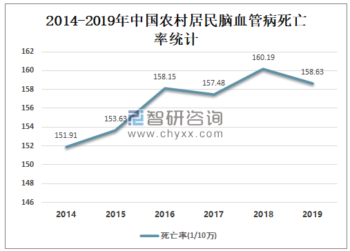 2014-2018年中国农村居民脑血管病死亡率呈上升趋势,2018年中国农村居民脑血管病死亡率为160.19/10万,较2017年增加了2.71/10万,2019年较2018年有所下降,2019年中国农村居民脑血管病死亡率为158.63/10万,较2018年减少了1.56/10万。