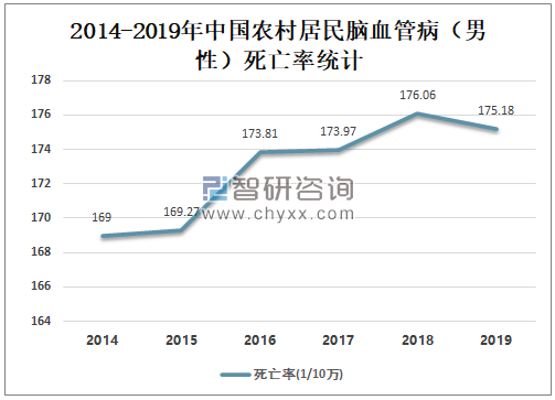 2014-2018年中国农村居民脑血管病(男性)死亡率呈上升趋势,2018年中国农村居民脑血管病(男性)死亡率为176.06/10万,较2017年增加了2.09/10万,2019年较2018年有所下降,2019年中国农村居民脑血管病(男性)死亡率为175.18/10万,较2018年减少了0.88/10万。