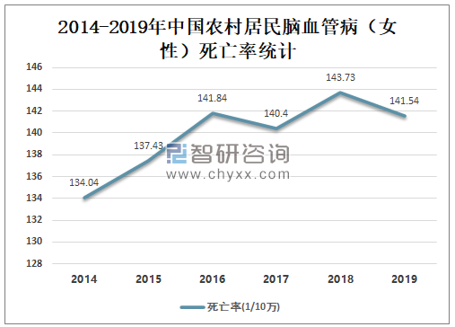2014-2018年中国农村居民脑血管病(女性)死亡率呈上升趋势,2018年中国农村居民脑血管病(女性)死亡率为143.73/10万,较2017年增加了3.33/10万,2019年较2018年有所下降,2019年中国农村居民脑血管病(女性)死亡率为141.54/10万,较2018年减少了2.19/10万。