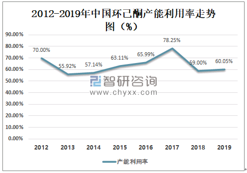 智研咨询发布的《2021-2027年中国环己酮产业竞争现状及发展前景预测报告》数据显示:2013-2017年中国环己酮产能利用率逐年增加,2018年开始下滑,2018年中国环己酮产能利用率为59.00%,较2017年下滑了19.25%,2019年较2018年小幅增长,2019年中国环己酮产能利用率为60.05%,较2018年增加了1.05%。