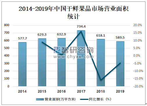 2017-2019年中国干鲜果品市场营业面积持续减少,2019年中国干鲜果品市场营业面积为589.5万平方米,较2018年减少了28.6万平方米。